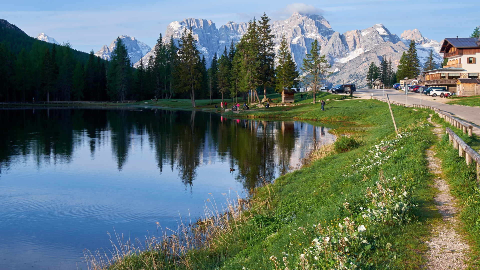 位於普斯特山谷東端,湖水呈現綠松石般的色澤,背後矗立著塞科菲爾峰(Seekofel),構成鮮明景致。夏日晴朗時,湖面清澈如藍寶石般倒映群山;陰天時,湖水則泛出祖母綠的色彩,展現不同風貌。