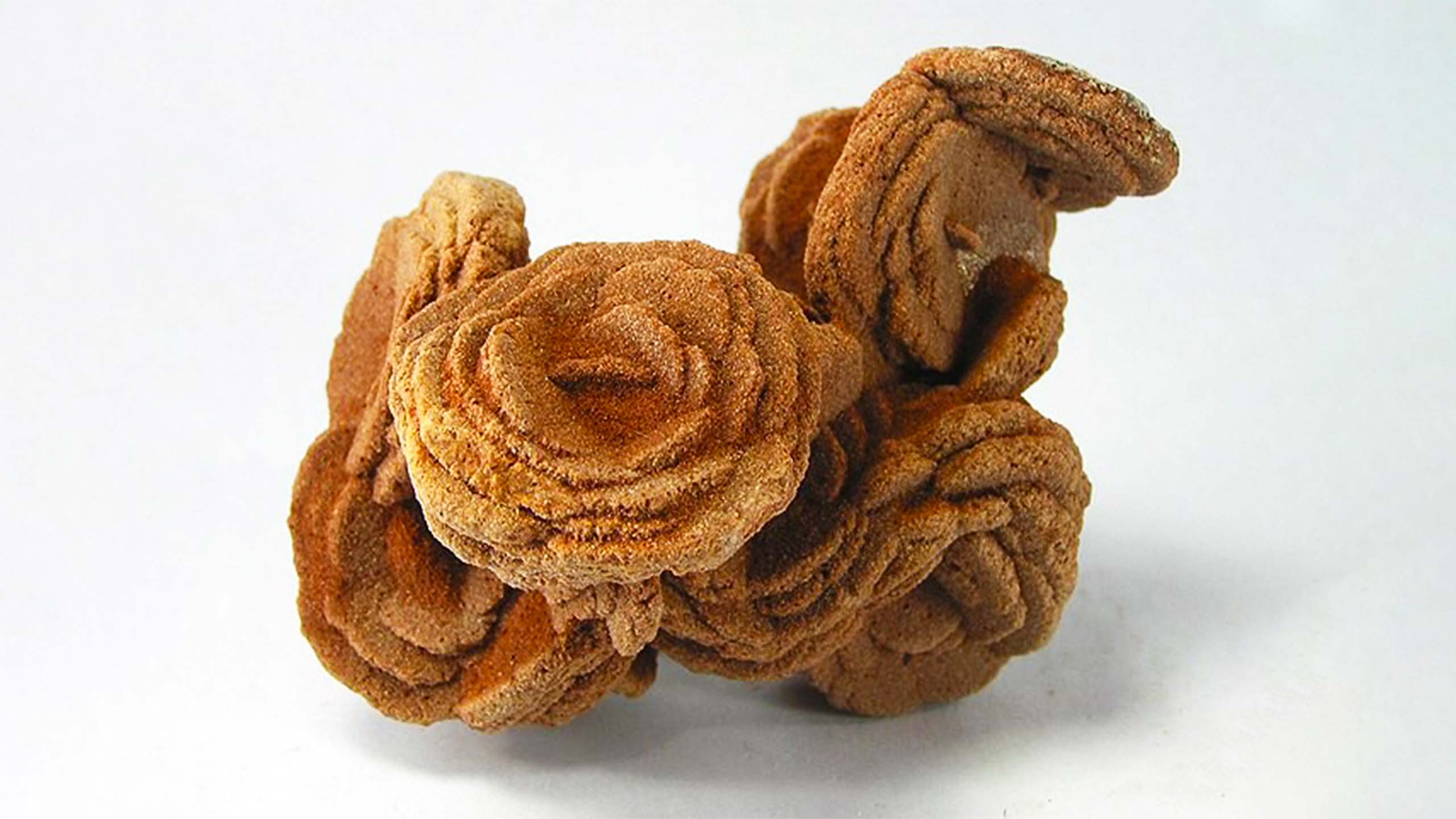 主要成分含石膏,火山岩漿冷卻後,經年累月石頭自然變遷和日曬風蝕形成,多片板狀結晶交叉,形成千姿百態的玫瑰石。
