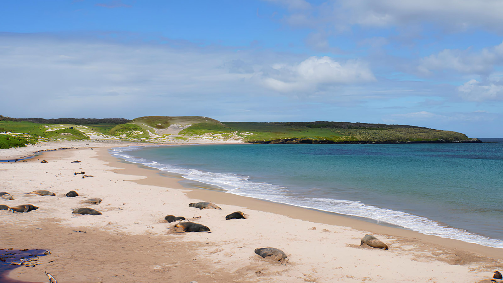 我們的計劃是登陸桑迪灣,這是奧克蘭群島三個虎克海獅(又稱紐西蘭海獅)的繁殖地之一,虎克海獅是海豹家族中的稀有成員。雄海獅會聚集在海灘上保衛它們的後宮,並在母海獅產下幼崽後不久與它們交配。岸上有很多選擇,有長有短,還有時間欣賞野生動物。步行相對輕鬆,木板路橫跨島嶼,直達險峻的西側懸崖,我們沿著海岸線繞島一周。