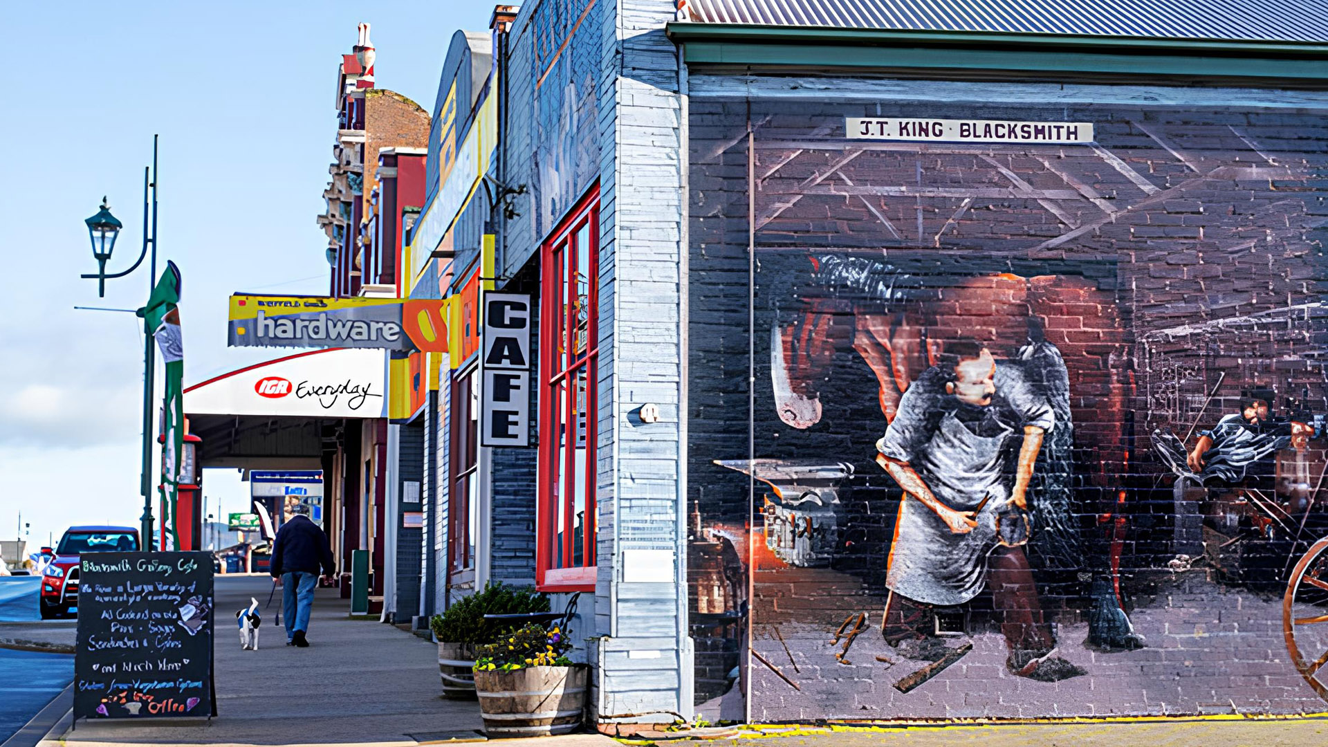 有百年歷史的小鎮,當時當地經濟蕭條,為了吸引觀光客來訪在小鎮的牆面上描繪上以開拓者故事及小鎮歷史為主題的壁畫此有壁畫小鎮美名。充滿藝術氣息的壁畫小鎮,最早的一幅壁畫誕生於 1986 年,整座小鎮都是藝術家們的創作工房,有超過 50 處壁畫和 8 座雕像,被鎮民引以為傲。其中,港星 陳奕迅也在此留有一幅作品喔。