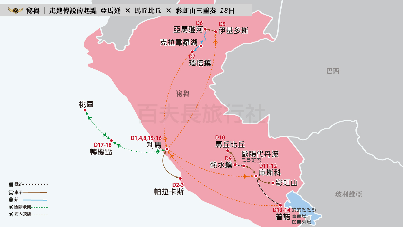 旅途中百夫長將安排市場獨家的騎摩拖車上彩虹山行程,以及的喀喀湖到蘆葦島、塔吉列島雙島行程,探索島上獨有的男性編織文化。旅客能在景觀列車上用餐、免去拉車疲勞,更會入住頂尖五星酒店、享用祕魯廚神料理。2024-2025年6月祕魯太陽祭已達20人滿團。