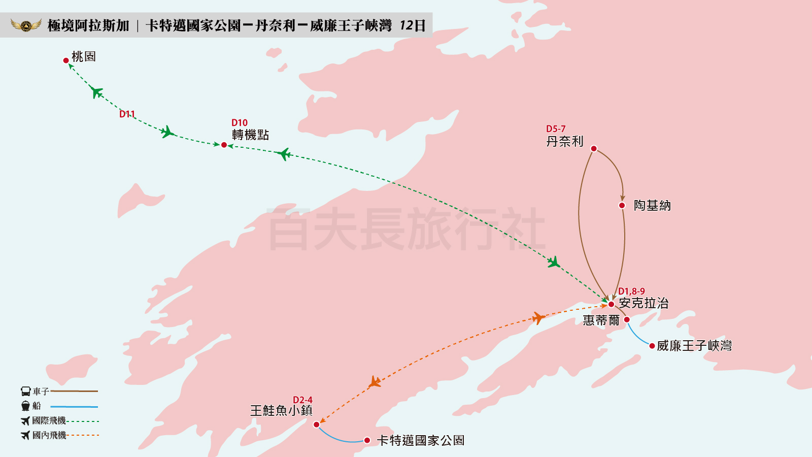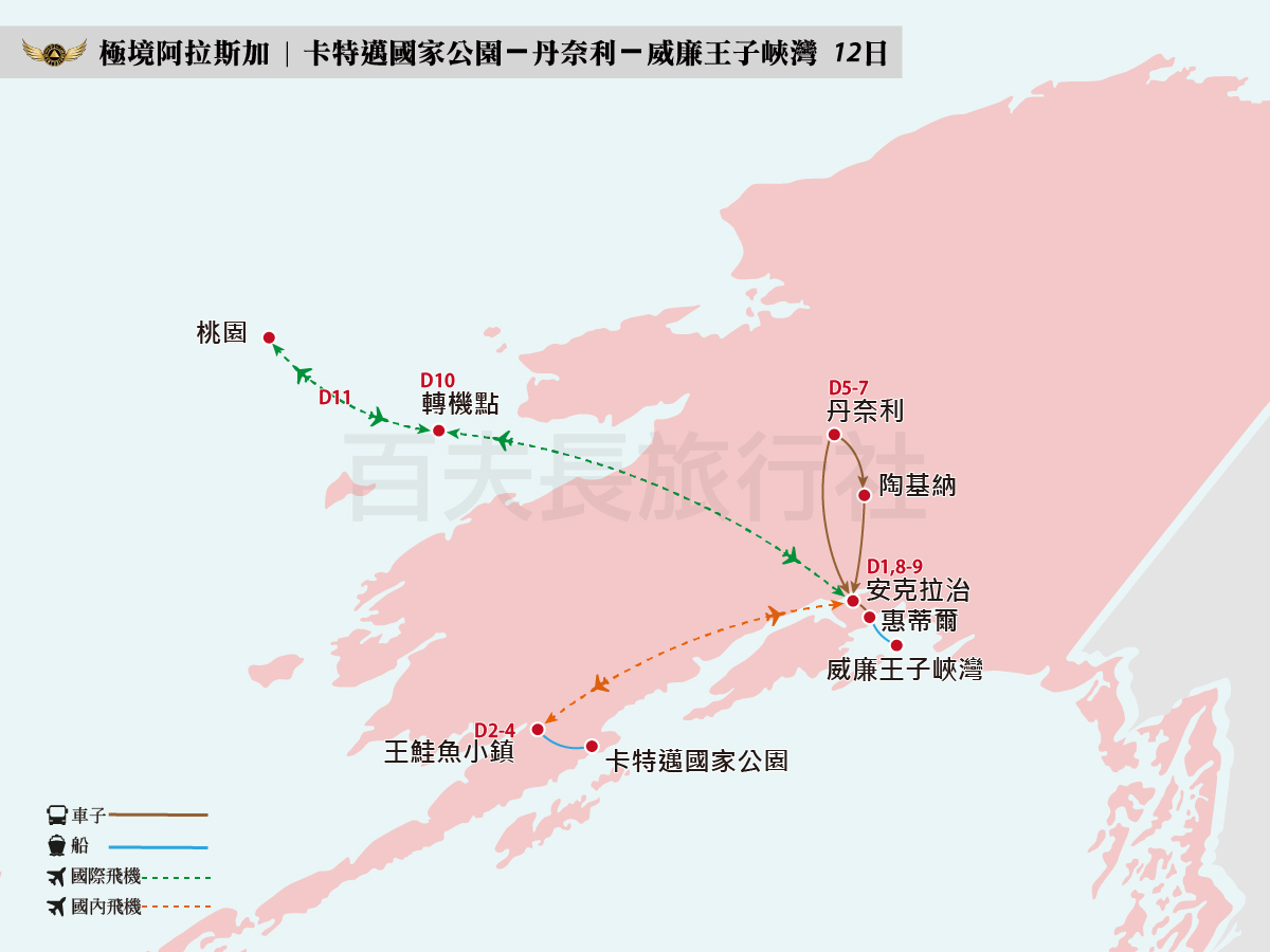 貼心行程規劃 : 除王鮭魚小鎮與丹納利國家公園需共乘園區巴士外,其餘行程皆搭乘本公司專屬巴士,讓探索荒野也能舒適從容。