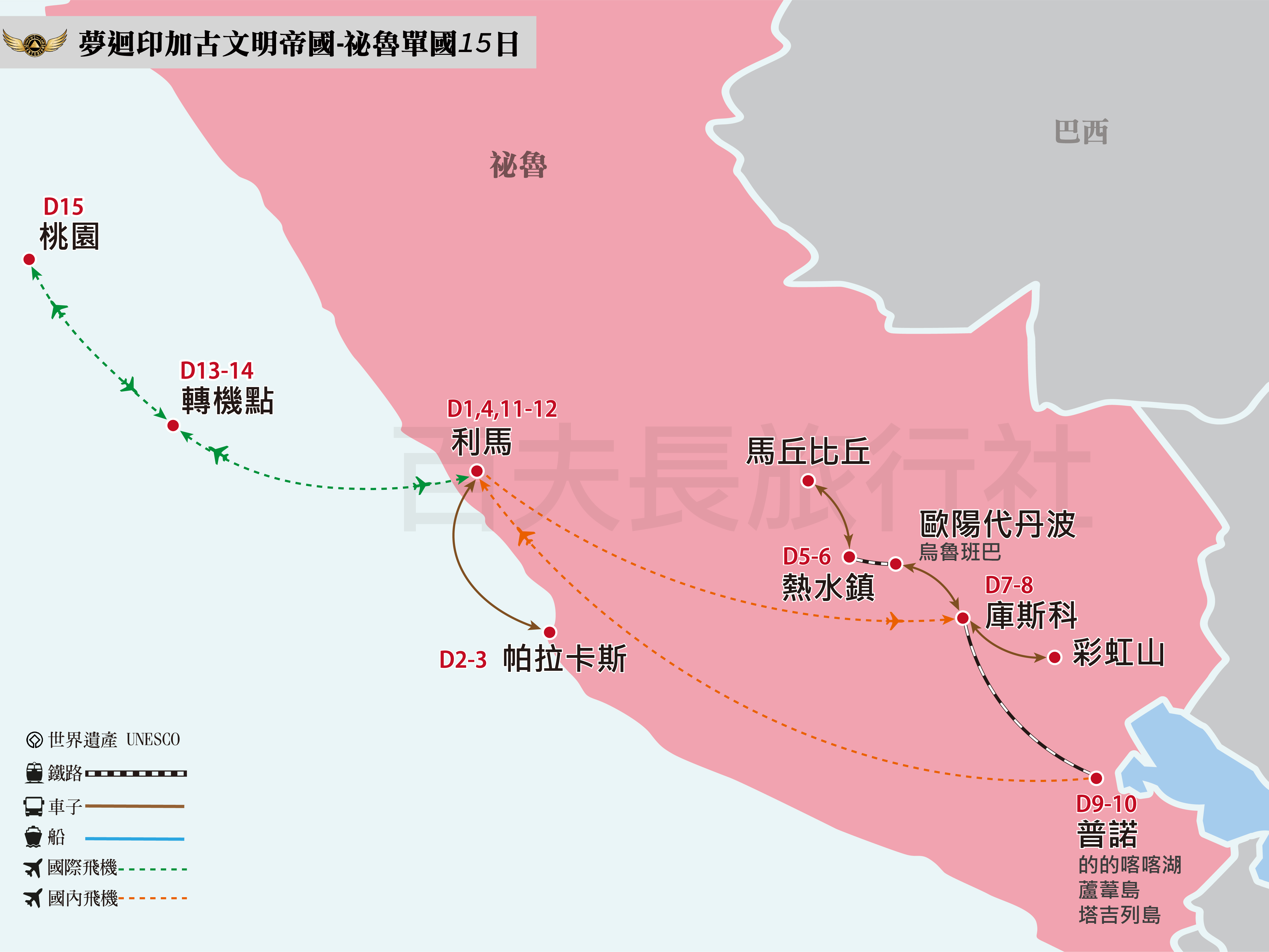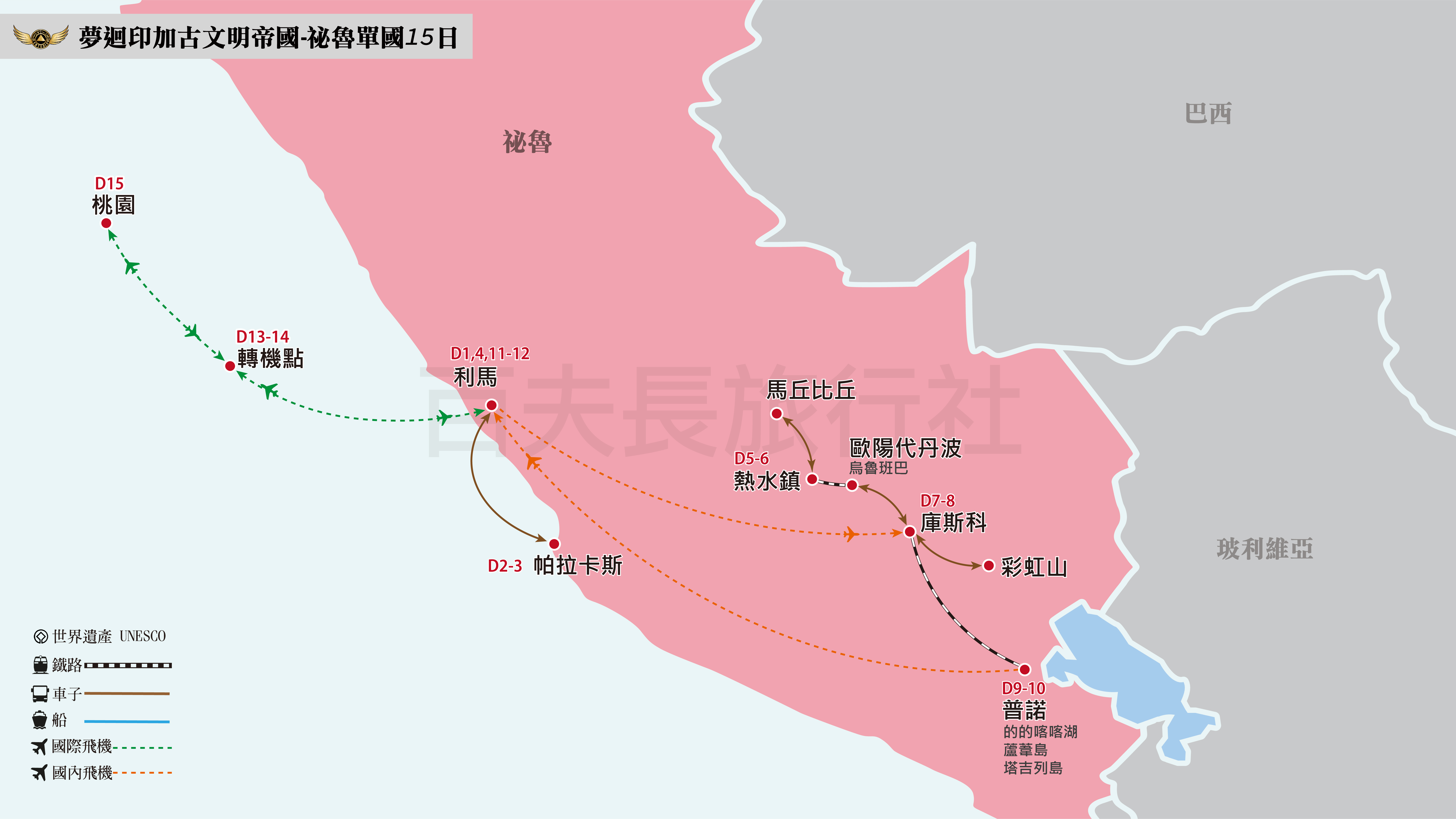 旅途中百夫長將安排市場獨家的騎摩拖車上彩虹山行程,以及的喀喀湖到蘆葦島、塔吉列島雙島行程,探索島上獨有的男性編織文化。旅客能在景觀列車上用餐、免去拉車疲勞,更會入住頂尖五星酒店、享用祕魯廚神料理。2024-2025年6月祕魯太陽祭已達20人滿團。