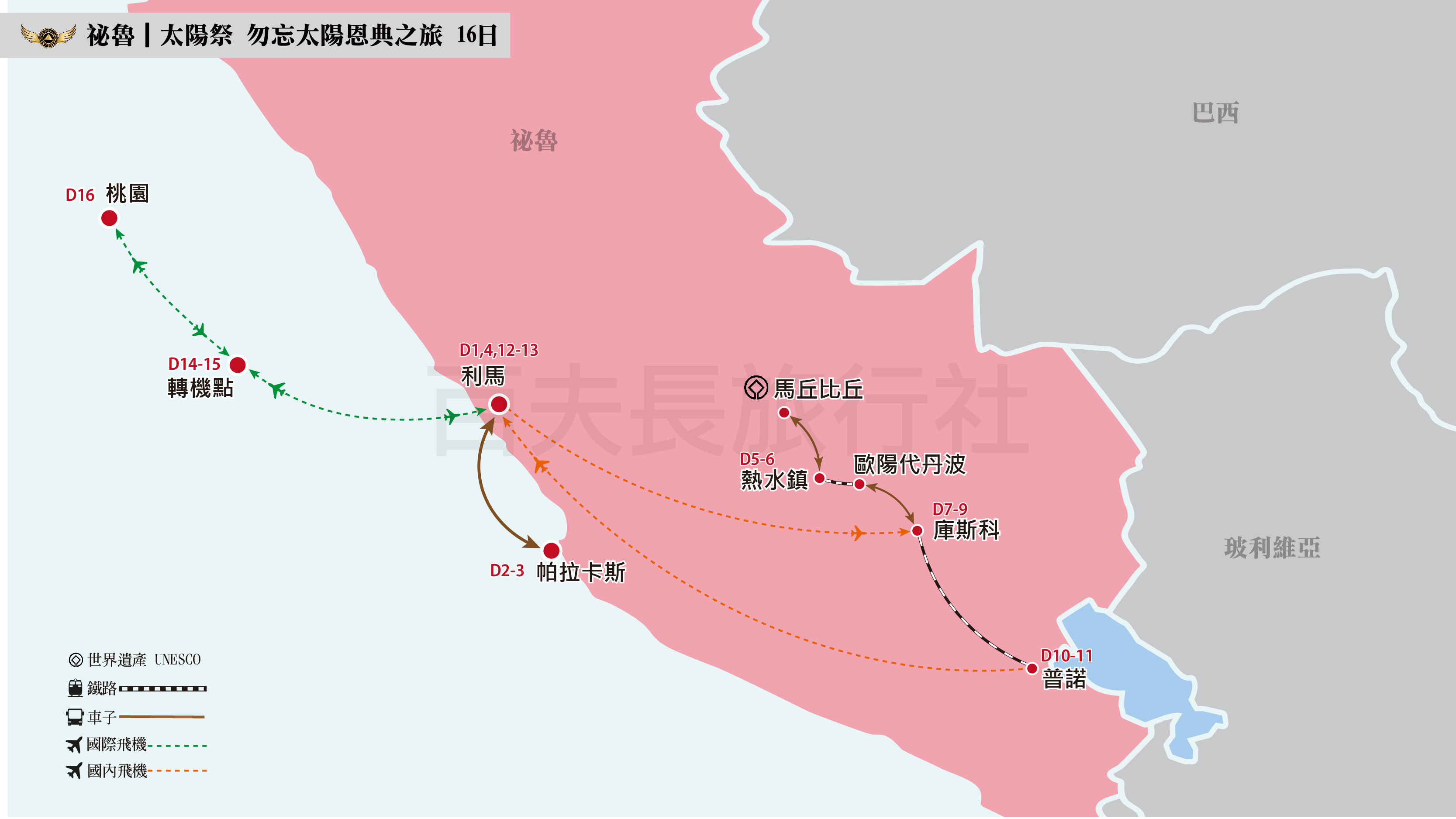 探索巴雷斯塔斯鳥島、世界上海拔最高內陸湖的的喀喀湖、前印加時期的安地斯鹽田以及印加人農業智慧結晶的圓形梯田,體驗古文明的驚奇和神秘。